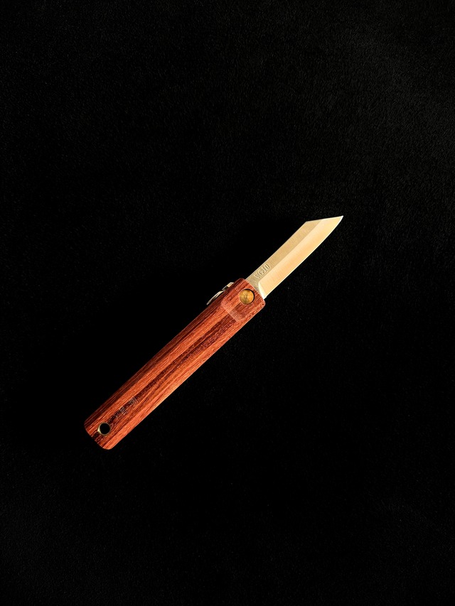 伝統的な日本の折り畳みナイフ「肥後守」に木製の柄を付けました。 •特徴 オリジナルの肥後守は、薄い金属製の柄が特徴で、折り畳むと非常にコンパクトで持ち運びに便利です。しかし、その柄の薄さから、長時間の使用やしっかりと力を入れて削る作業にはやや不向きな面もありました。 そこで、この肥後守には厚みのある木製の柄を採用し、握りやすさと力の伝わりやすさを向上させています。また、さまざまな木目の美しい表情もお楽しみいただけます。 •鋼について 刃の部分にはステンレス鋼VG10を使用し、地金にはSUS304を採用しました。鋼も地金もステンレス系で、優れた切れ味を持ちながらも、サビに強く扱いやすさも兼ね備えています。 •こちらは先日公開したYouTubeで製作した限定モデルです。 https://www.youtube.com/watch?v=uv_7YvfIcXo&t=11s ハンドル素材: パオロサ ✱ パオロサ 南米原産のマメ科の広葉樹であるパオロサは、非常に硬く、重厚な材です。 この材を初めて使ったのは、20年以上前になります。その硬さゆえに仕上げには大変な労力を要しましたが、その分、磨き上げた際に得られる表情の美しさに、達成感を強く感じたことをとてもよく覚えています。 個人的にはこの材の最も惹かれる点は柾目です。 紫、赤褐色から薄いクリーム色に近い色まで、その色味のレンジがとても幅広く、それが揺らぎながら整列している様子です。 今回のハンドルも、自分が思うパオロサが持つ最高の「表情」を切り取るように、木取りをしています。 ✱ 肥後守とは 肥後守は兵庫県三木市にある100年以上の歴史を持つ鍛冶屋「永尾カネ駒製作所」の登録商標です。現在5代目が伝統を守りつつ新しい技術を取り入れ、折り畳みナイフを製作しています。 ⚠️使用状の注意 ● 本製品は刃物です。取り扱いには十分ご注意ください。 ● 使い込んでくると木の痩せなどの影響を受け、刃物部分の固定が緩んで来ることがあります。その際は使用を中断しマイナスドライバーでネジを締めてからお使いください。 ●使用する際は、周囲の安全を確認し、他人や物を傷つけないようにご配慮ください。 ●小さなお子様の手の届かない場所に保管してください。 ●木部の変形、破損の原因となりますので、直射日光や高温多湿なところに放置しないでください。 ●長時間水にさらさないでください。使用後はしっかりと水分を拭き取ってください。 ●本製品の使用に起因する事故や怪我について、当社は一切の責任を負いかねます。ご理解の上、安全にご使用ください。 初期不良について 初期不良については、購入後2週間以内にお申し出ください。初期不良と判断される場合、製品の検証を行いますが、検証の結果、通常の使用方法に基づかない損傷などが確認された場合は、初期不良として認められないことがございますので、ご了承ください。